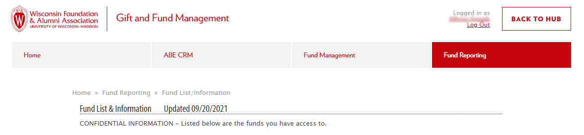 Within the Gift and Fund Management website, you can view fund detail information as well as create a variety of reports. To access either fund information or available reports, log in to Gift and Fund Management, and navigate to Fund Reporting > Fund List/Information.