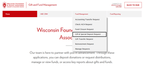 The Gift and Special Deposit Form is used to submit gift information. The form is completed through the Gift and Fund Management website, printed, and mailed to the UW Foundation, US Bank Lockbox.